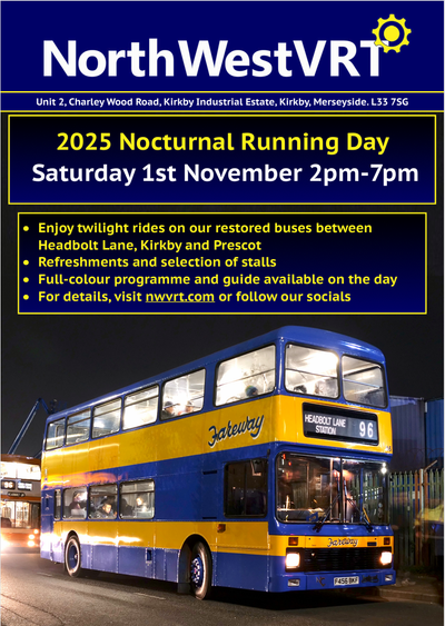 The North West Vehicle Restoration Trust attend a wide assortment of bus rallies, road runs, local shows, running days and other social events throughout the year, these will be listed on this page prior to us attending or visiting an event.